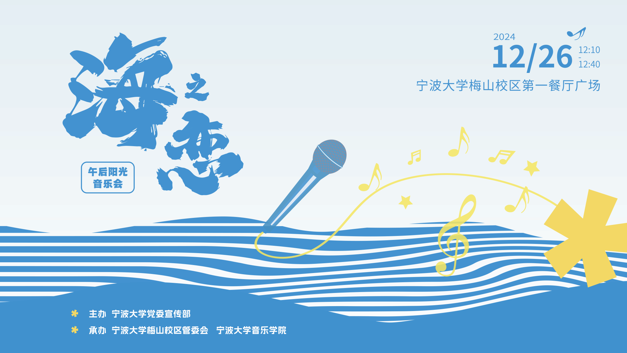 海韵悠扬,乐动梅山。12月26日,学校将举行午后阳光音乐会之“海之恋”梅山校区专场演出,欢迎广大师生前往观看。