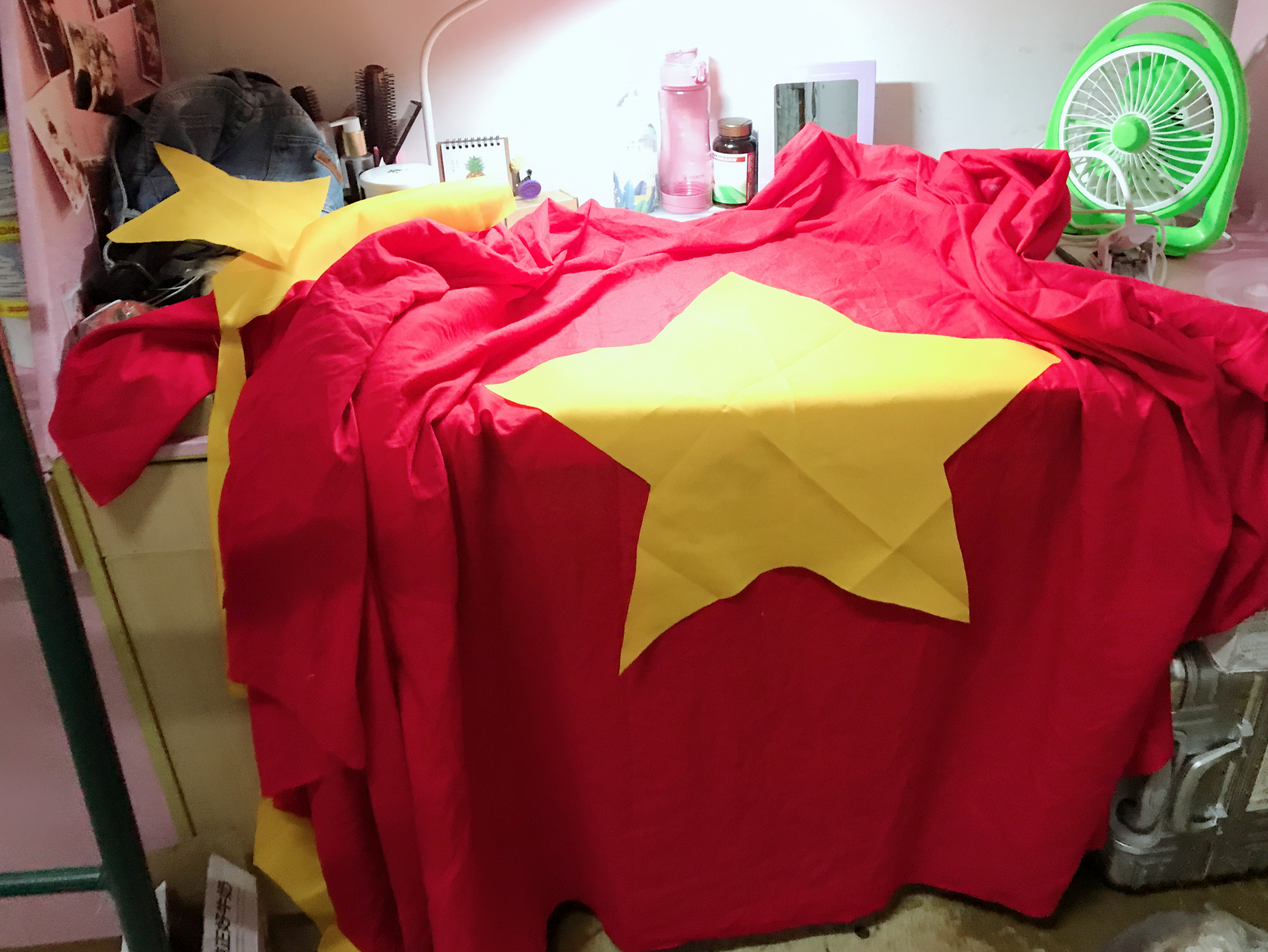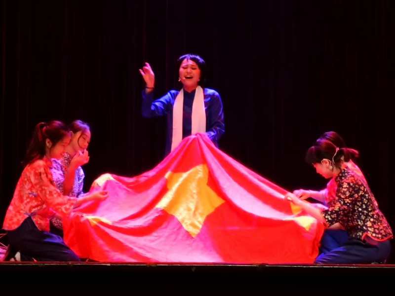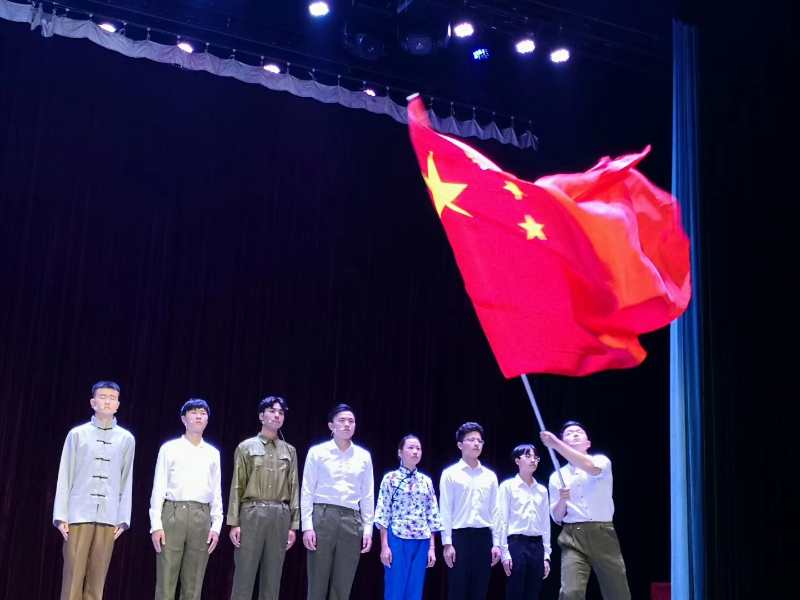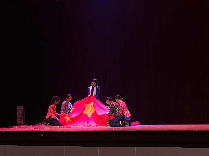 本次短剧的道具负责人、杨二嫂的扮演者姜缘同学说:“我们买了红布和黄布,我按照资料图片一点点剪出五角星的形状,一针一针把五角星绣在了红布上,就要绣完的时候,我忍不住落泪了,我手中的这面红旗,承载了多少革命烈士的热切期盼啊!”