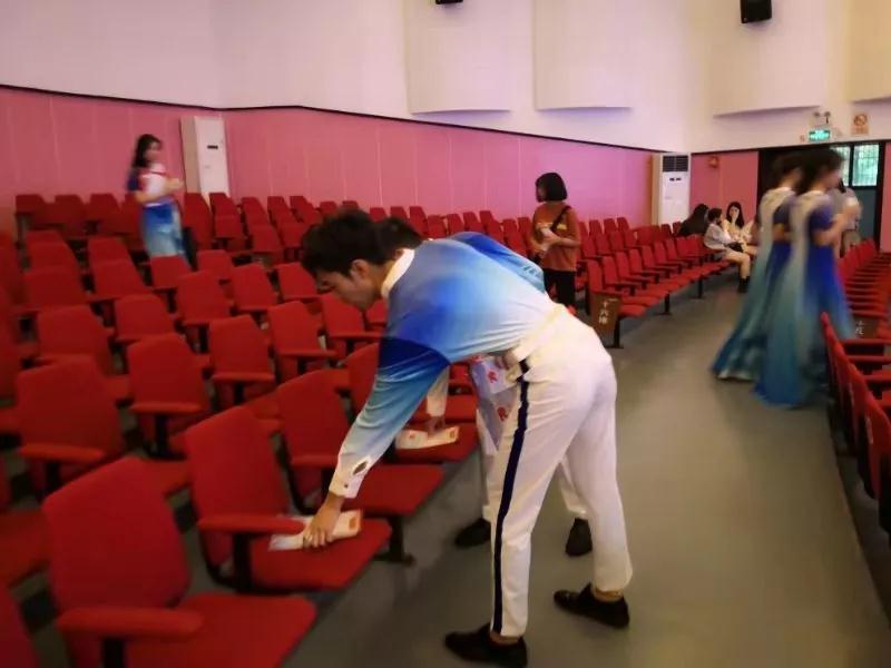 合唱团的同学们在老师的带领下集体留下来,认真回收小国旗,逐排收集空水瓶、节目单,仔细清理会场的角角落落,他们默默付出的背影,甚至比他们的歌声还要美,还要清澈透亮。