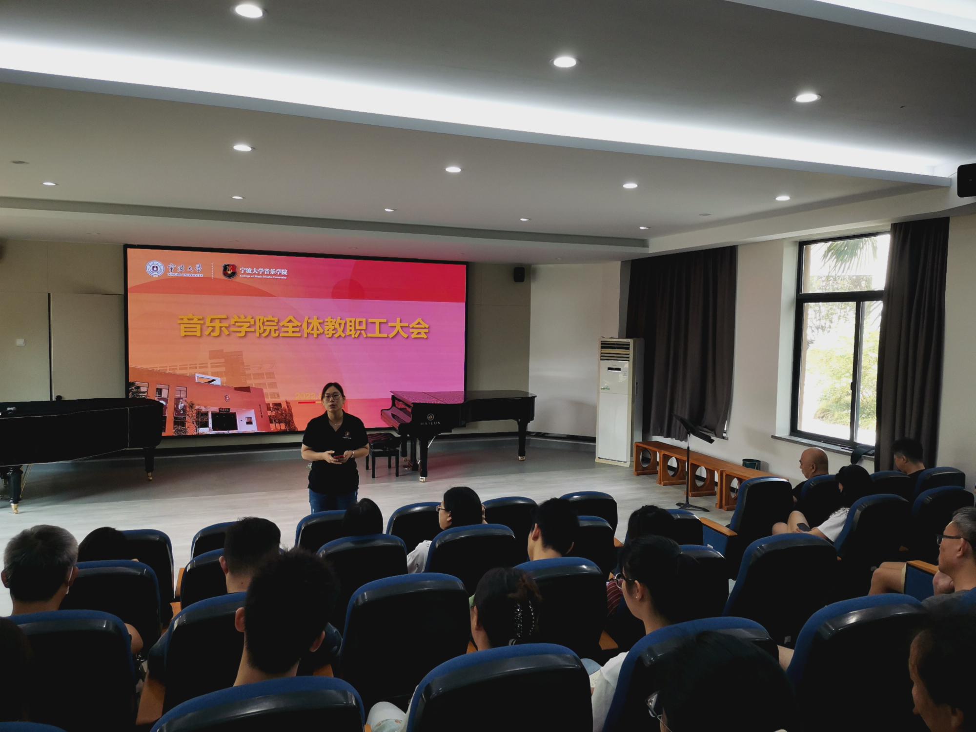 8月26日中午,学院在逸夫艺术楼一楼会议室召开了本学期第一次全院教职工大会。学院党政领导班子、全体教职工参加。会议由学院特聘院长俞子正主持。