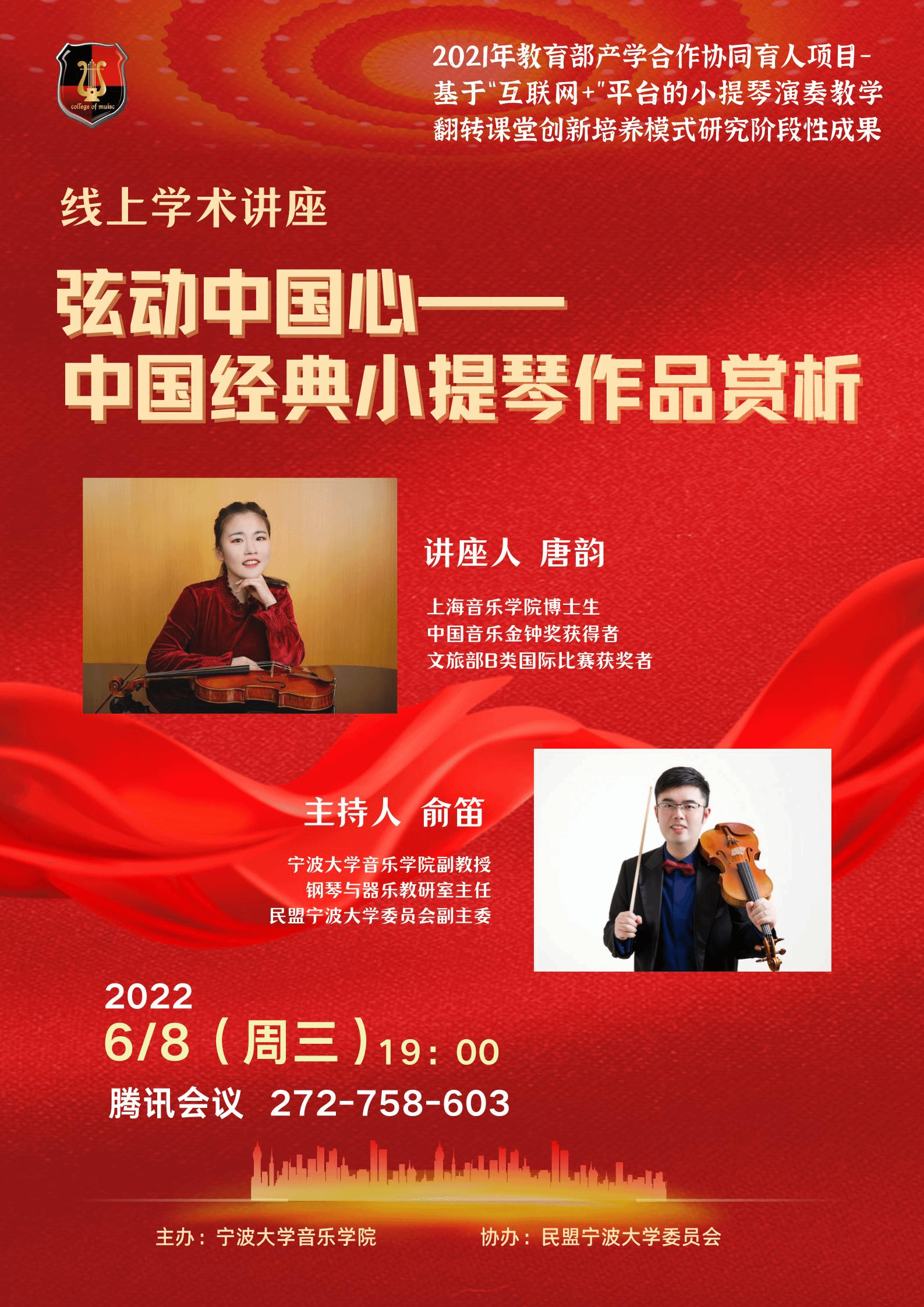 本次讲座将结合2021年教育部产学合作协同育人项目-基于“互联网+”平台的小提琴演奏教学翻转课堂创新培养模式研究成果,对中国经典小提琴作品进行解读,利用互联网技术传播,弘扬中华文化,促进音乐美育。