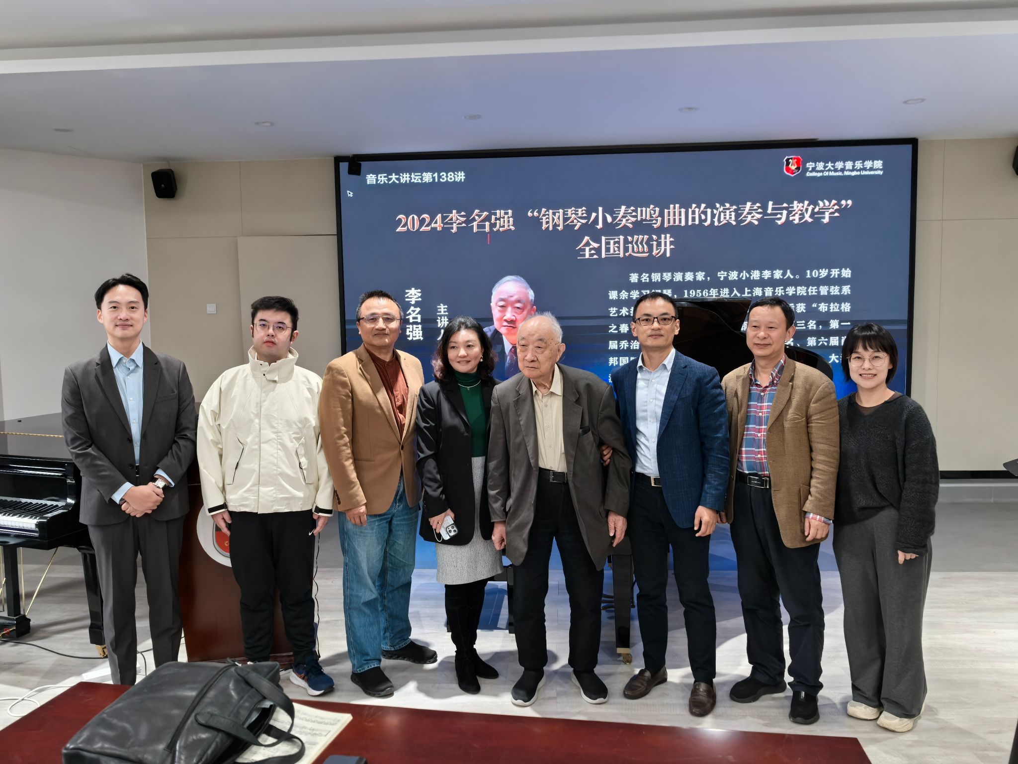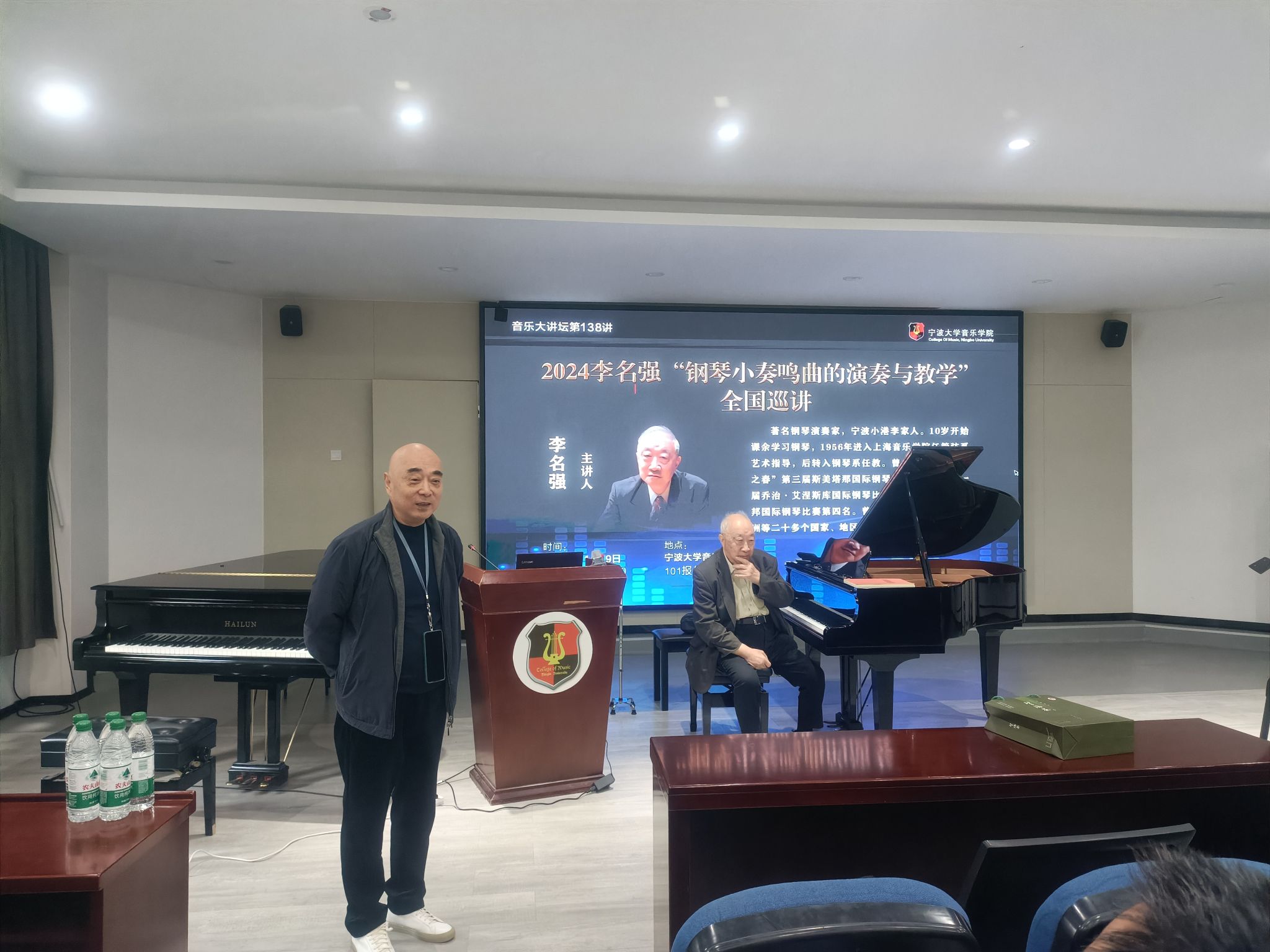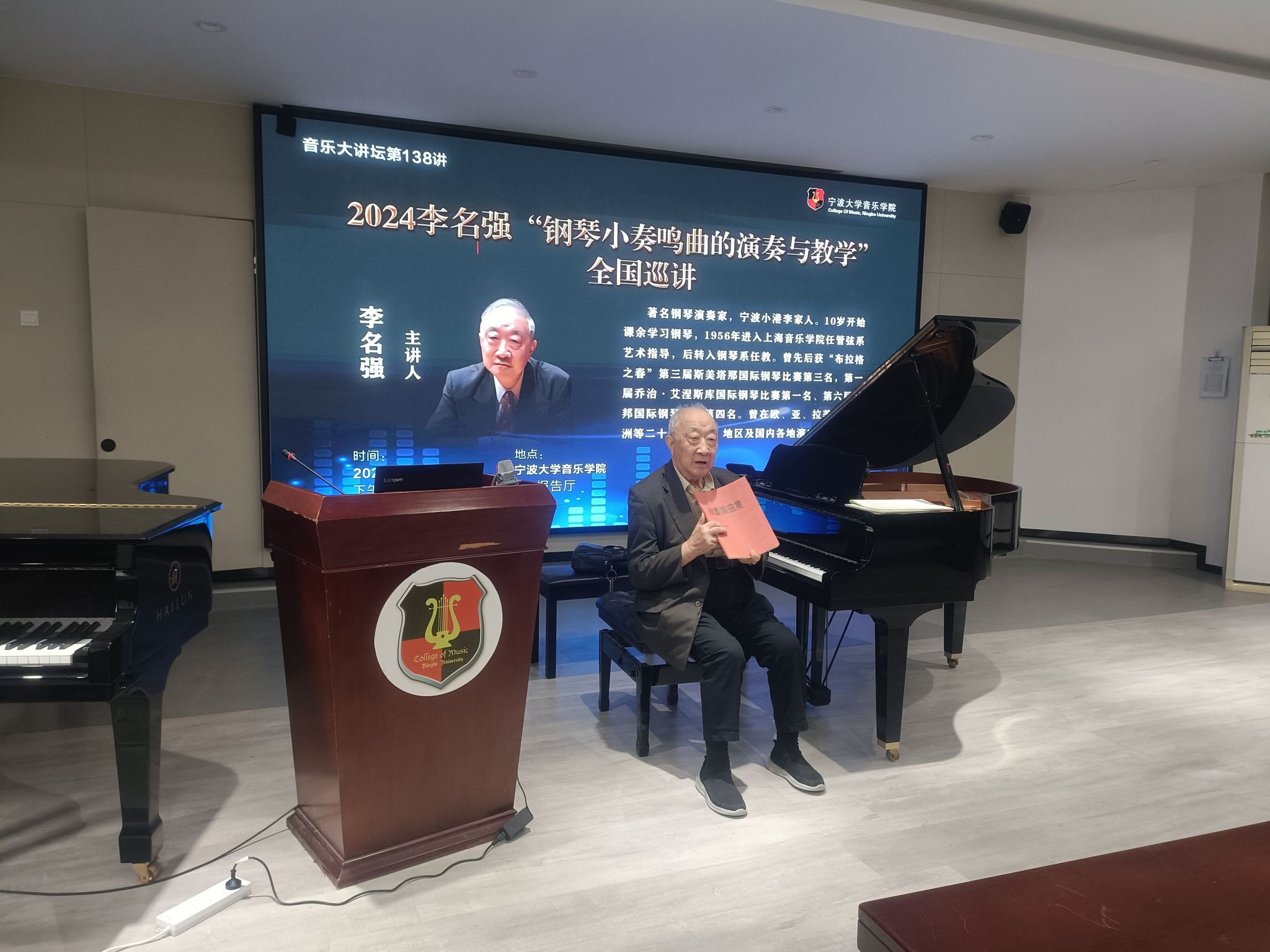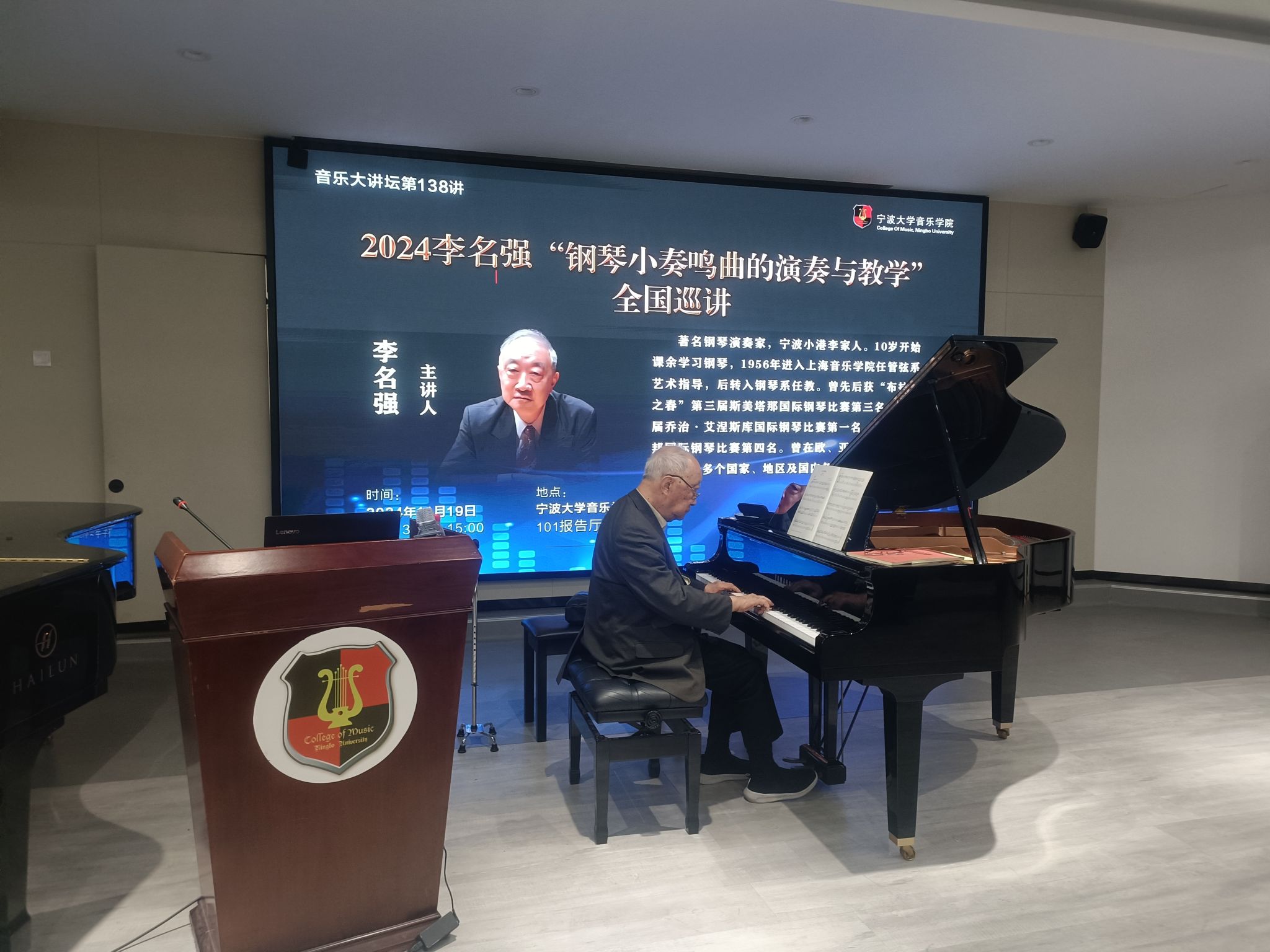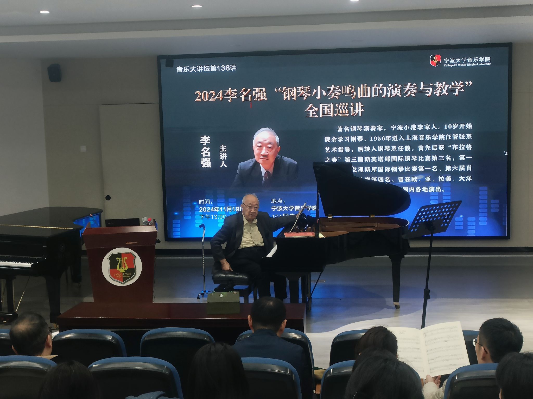 20241119日 下午,著名钢琴演奏家李名强在NT动漫 101报告厅举办《2024李名强“钢琴小奏鸣曲的演奏与教学”全国巡讲》大师班,NT动漫 部分师生进行了现场观摩。李名强,著名钢琴演奏家,宁波小港李家人。10岁开始课余学习钢琴,1956年进入上海NT动漫 任管弦系艺术指导,后转入钢琴系任教。曾先后获“布拉格之春”第三届斯美塔那国际钢琴比赛第三名,第一届乔治·艾涅斯库国际钢琴比赛第一名、第六届肖邦国际钢琴比赛第四名。曾在欧、亚、拉美、大洋洲等二十多个国家、地区及国内各地演出。