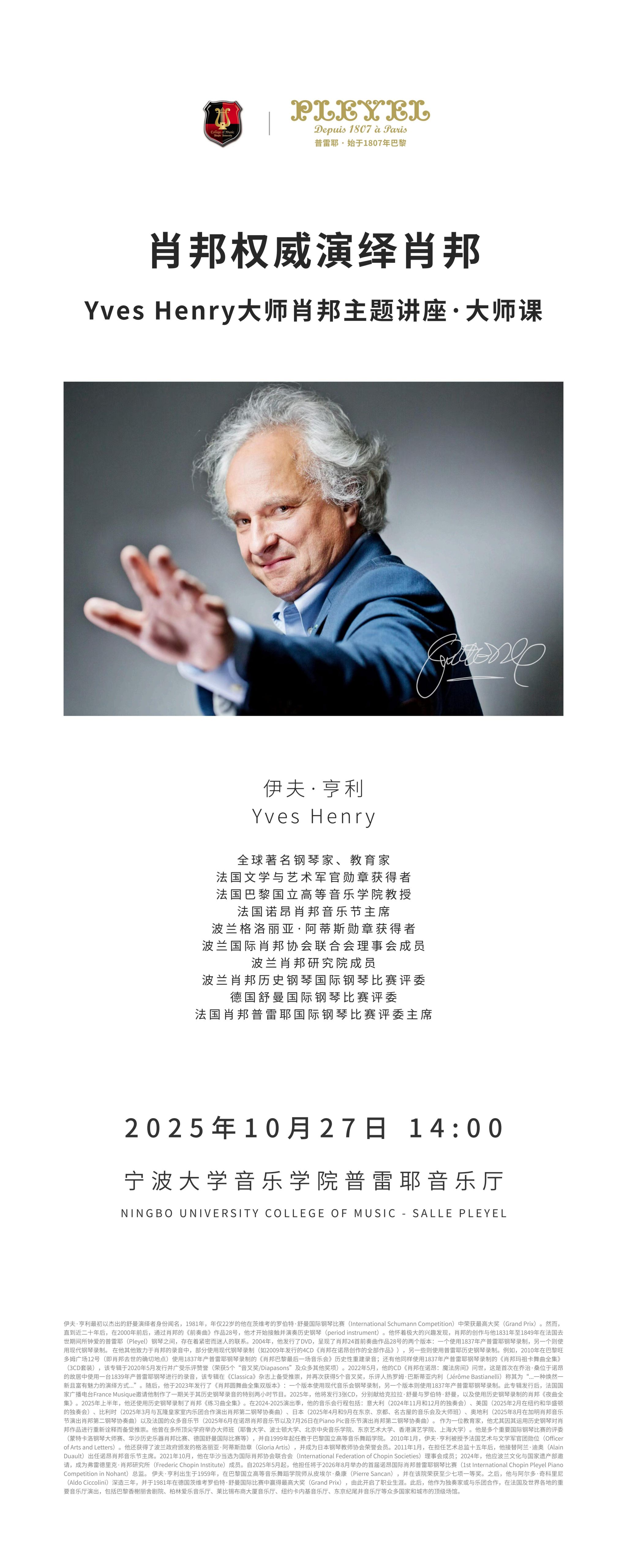 教授、国际著名钢琴家伊夫・亨利(Yves Henry)在此接连呈现 "肖邦权威聊肖邦" 主题讲座与钢琴大师班,为在场师生带来一场兼具学术深度与艺术感染力的音乐盛宴。