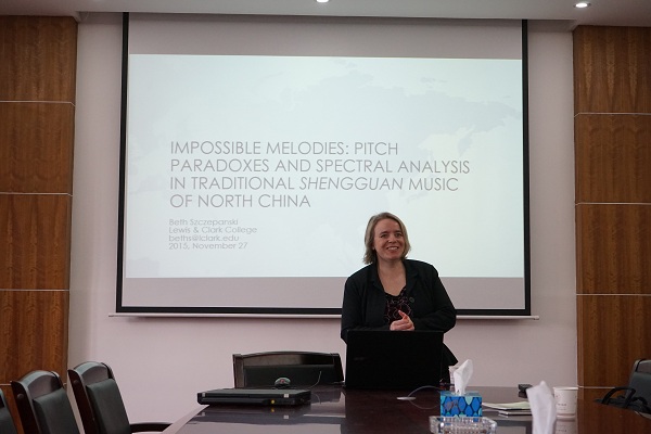 师生带来了有关“五台山佛教音乐”的学术讲座。Beth教授曾在五台山居住了10个月,因而得以掌握了大量的第一手资料,对五台山佛教音乐中的笙管乐有着深入的分析和研究。Beth教授通过对其中笙管乐器的声谱和音频的记录和分析研究,发现:管子的基音很强,在一个八度后响度逐渐变弱;而笙的第一个泛音比基音的响度还要大。