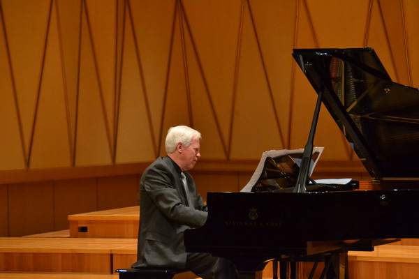 两位美国钢琴家为观众们精心挑选了异彩纷呈的音乐作品,上半场是耳熟能详的古典钢琴音乐作品,让听众们徜徉在西方音乐的历史长河中;下半场则是美国爵士钢琴音乐的盛宴,也由此掀起了本次音乐会的高潮。勃拉姆斯的《华尔兹组曲》在约翰·塞尔文和安东尼奥·特鲁奥斯的共同演绎下,顿时变得生动起来。高音区的清脆细腻,低音区的深沉柔美,在他们的指尖下仿佛展现了一幅幅美丽动人的舞蹈场面,一支黑白键上的华尔兹舞映入眼帘。而一首《白发》作为安东尼奥·特鲁奥斯献给老师约翰·塞尔文的爵士作品,塞尔文幽默的出场方式、师徒二人时而站立时而坐下、双足随着音乐敲击地面的声响等即兴表演,吸引了观众的注意力,也博得了观众们的欢呼与赞叹。同时,这种看似随性的演奏方式在展现他们默契与信任的同时,更让观众们感受到了美国爵士音乐的无穷魅力。动情之处,特鲁奥斯会默声唱着歌词;曲终时,两人顺势将手交织于键盘上,并相视一笑,仿佛让观众们体会到了演奏所带来的内心愉悦和满足感。而两位钢琴家对《浏阳河》、《采茶扑蝶》、《翻身的日子》这三首中国作品的全新诠释,令在场的观众无不拍手叫好。(廖松清)