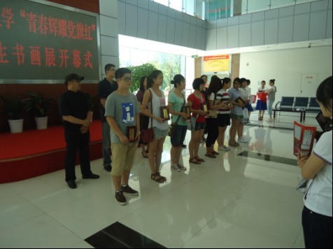 “青春辉耀党旗红”师生书画作品展在安中大楼一楼展厅隆重开幕。校工会常务副主席余雪华、校团委书记周青、校人事处/离退休工作处副处长刘缨和学院党政领导出席开幕式并为获奖学生颁奖。