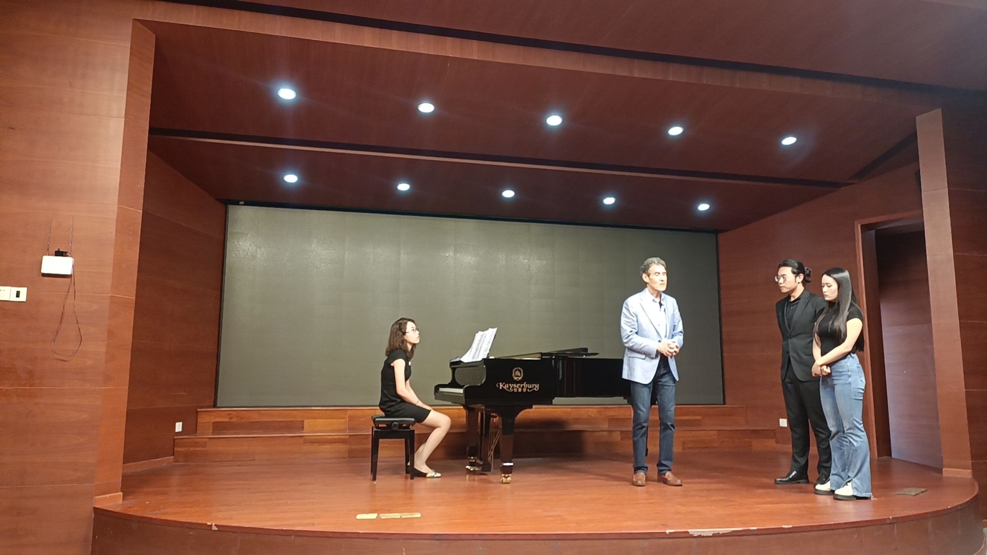 在表演礼仪方面,沃尔什教授重点介绍了在剧团面试时需要的礼仪,包括语言、仪态以及肢体动作等。沃尔什教授强调,在剧团面试时应表现出和演出时不同的状态,这包括了在表演前的准备和表演后的谢幕动作等。此外,与钢琴伴奏老师伴奏的配合也十分重要。许多情况下,歌手同钢琴伴奏仅进行过简单排练,甚至从未交流过。那么在表演前同钢琴伴奏的沟通便极为重要。