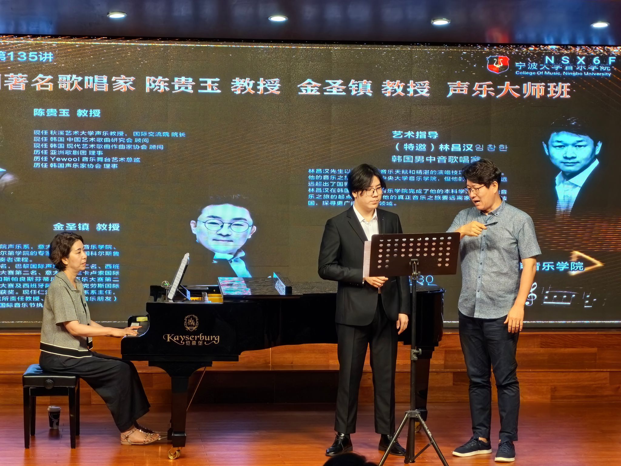 的学生带来了《女人心》、《赛船会前的安佐雷塔》等歌剧的经典唱段。林昌汉老师提出了在演唱声乐作品时候三个最重要的要素:音准、气息及咬字,并依次对这三点进行讲解教学。其中,音准是第一要素,也是声音演唱的基础。而对于呼吸及咬字问题,林昌汉老师表示,在演唱时应先有呼吸,后有咬字,在咬字发音前首先需要有完整的气息支撑,保持气息向上,在确保气息稳定后再咬字,五音也需要保持在一个位置发声。金圣镇教授则主要对作品的音乐风格、创作时期等要素进行讲解。如在演唱巴洛克时期的歌曲时应注意音色及颤音处理等,此外也应根据个人特点来增加演唱细节。
