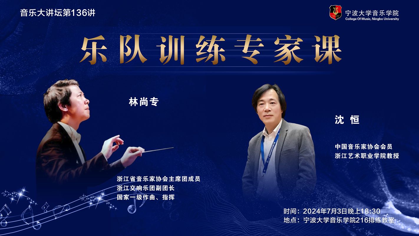 主讲人介绍:林尚专,浙江省音乐家协会主席团成员,浙江交响乐团副团长,国家一级作曲、指挥。沈恒,中国音乐家协会会员、浙江艺术职业学院教授。