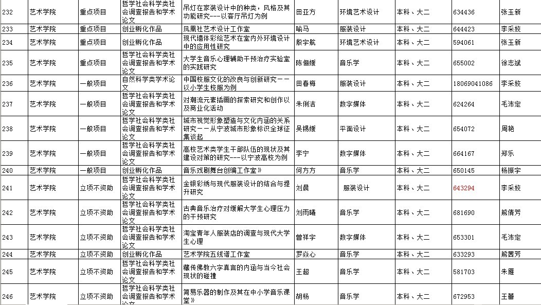 经学院初审及推报,学校组织专家小组对各项目进行最终评审,拟确定2013年NT动漫 大学生科技创新(SRIP)立项项目580项,其中重点立项项目116项,一般立项项目165项,立项不资助项目281项。现将拟立项名单进行公示,艺术学院一共入围18项,具体名单见附件。