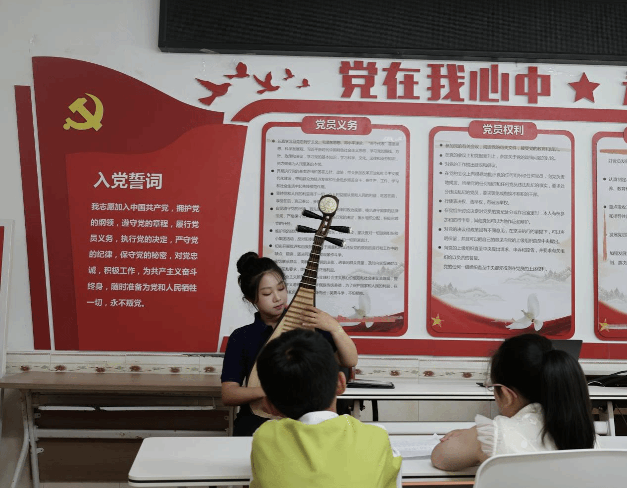 演出中,林子越同学以一曲《长鼓敲起来》拉开序幕,欢腾鼓点点燃现场;曲华杰演唱的《帕米尔,我的家乡多么美》,让高原风情与海岛浪花奇妙交融,孩子们跟着节奏轻晃小手,成了最动人的互动;徐樱宁的琵琶独奏《送我一支玫瑰花》,用国乐魅力诠释经典,让孩子们感受中华传统音乐的源远流长。