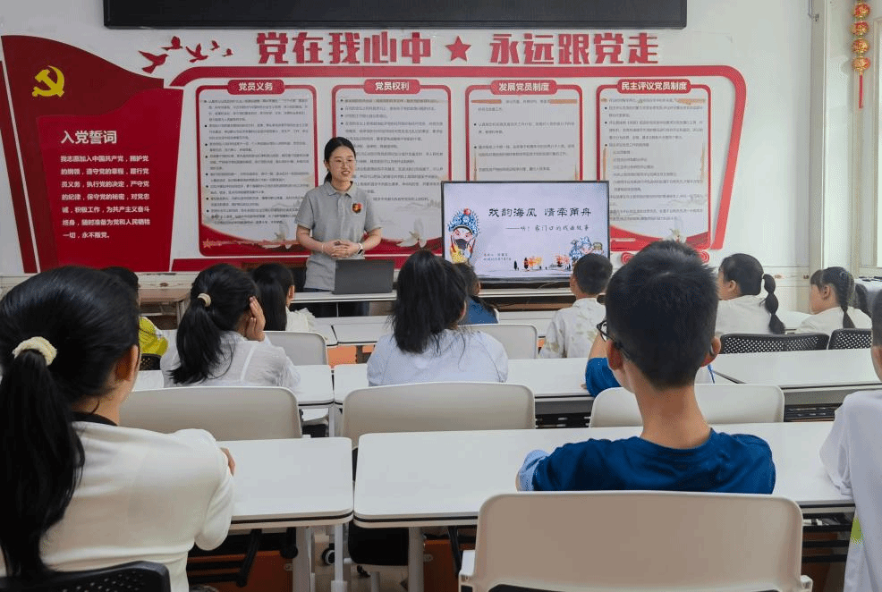 陈露霞同学以经典戏曲串联宁波与舟山情谊。赏析越剧《天上掉下个林妹妹》,婉转唱腔尽显江南灵秀;聆听甬剧《半把剪刀》,亲切乡音引发现场共鸣。“从宋代杂剧到越剧、甬剧,这些‘好声音’随海风登陆浙东海岸,藏着两地同根同源的血脉,更融在‘阿拉都是一家人’的乡音里。”陈露霞的讲解,让孩子们深刻感知戏曲里的地域情深与文化根脉。