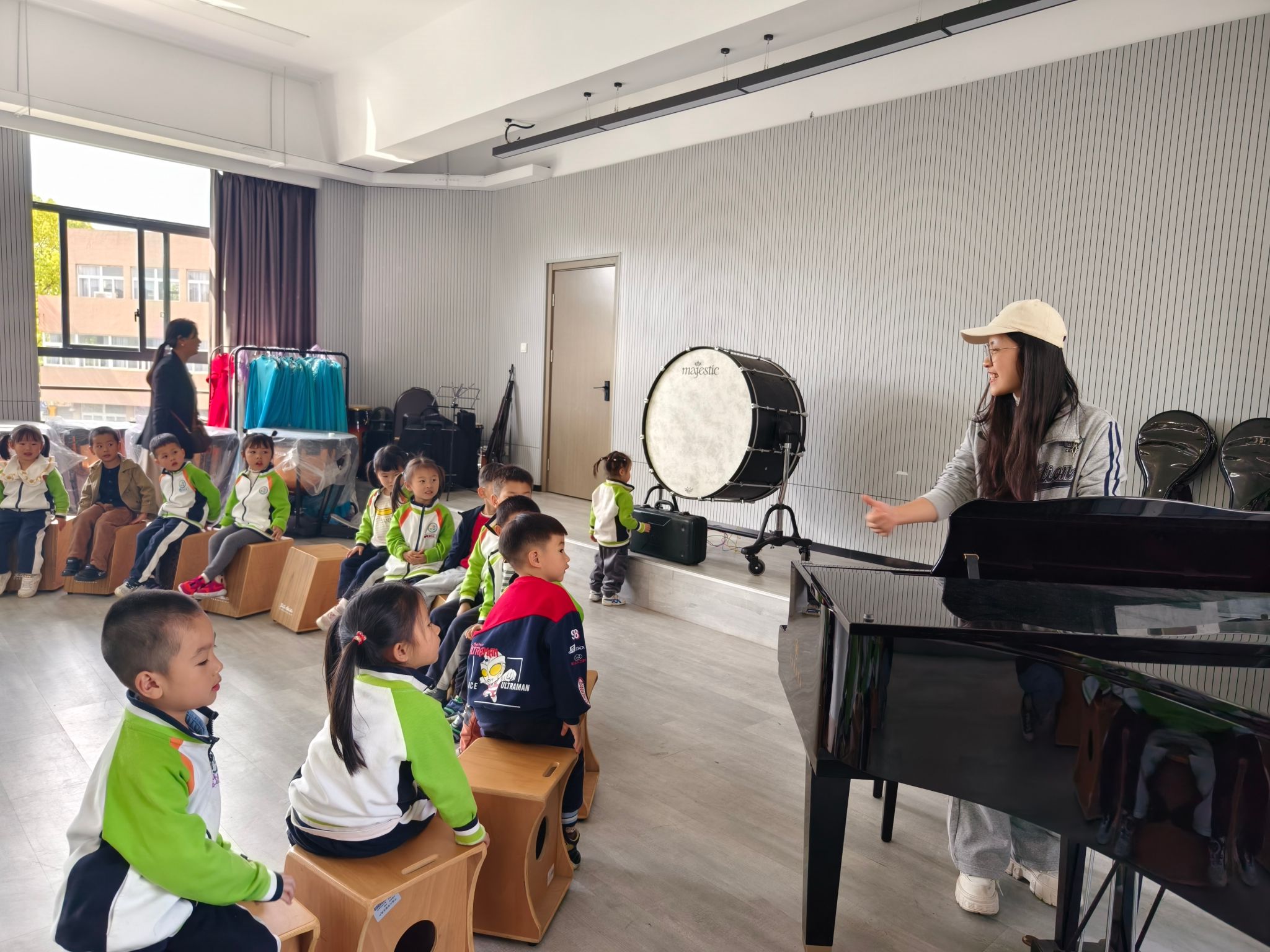 一楼的智慧琴房。孩子们好奇地打量着各种乐器和设备,眼中闪烁着对音乐的热爱和向往。他们的老师鼓励他们以后要好好学习,希望将来能够像这些大哥哥大姐姐一样,在自己热爱的领域发光发热。