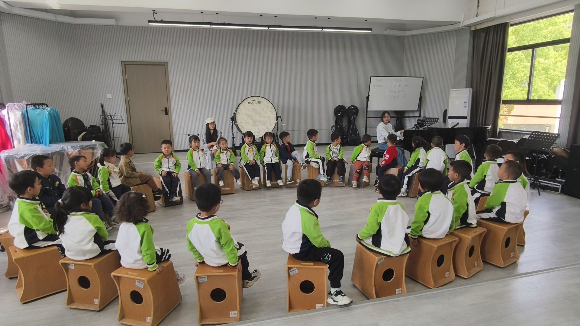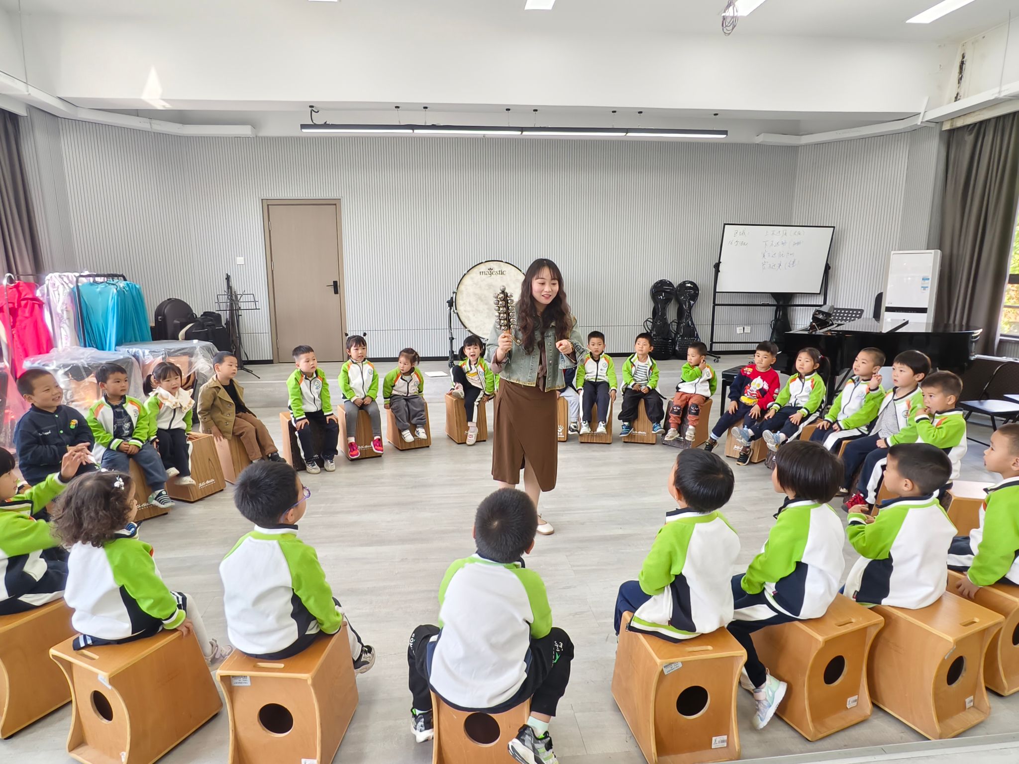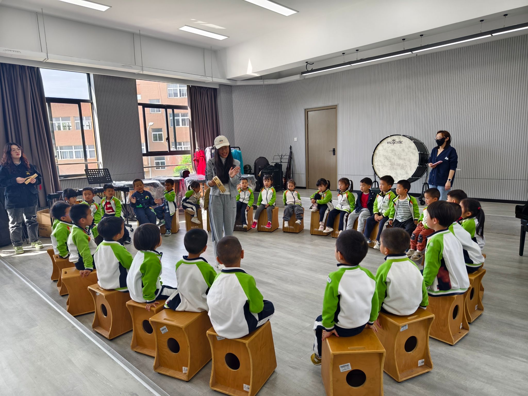 随后,学生党员们向小朋友们介绍了几种奥尔夫乐器,并让他们亲自尝试演奏。小朋友们一边好奇地抚摸着乐器,感受着它们独特的音色和质感,浸润式地体悟传统乐器和文化的美与力量,一边认真倾听箱鼓的发明和改进过程,聆听一曲曲热情洋溢的乐曲。