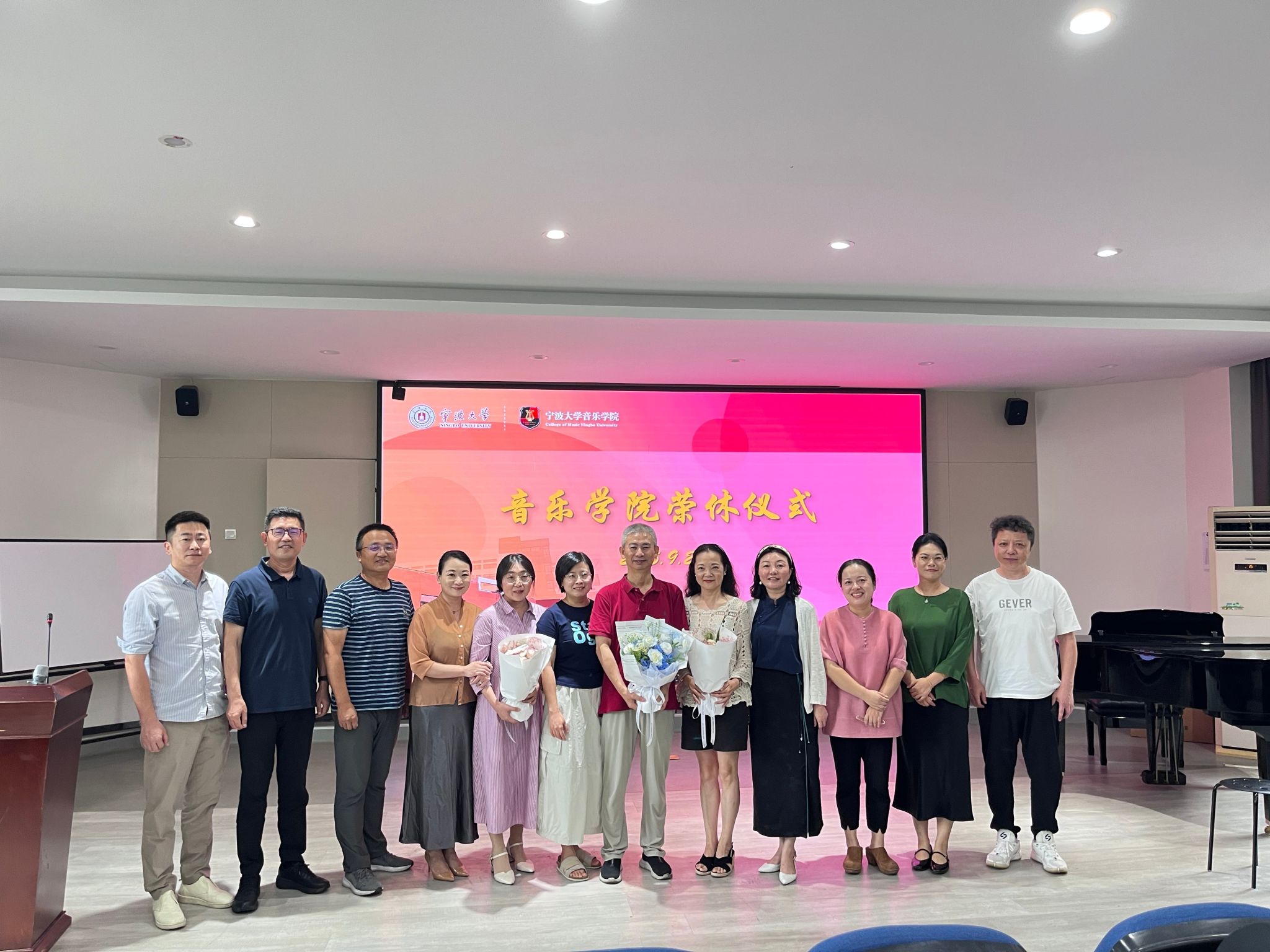仪式在温馨的氛围中正式开始。主持人赵老师首先代表学院致开场词,他向四位荣休教师多年来为学院建设与发展所付出的辛勤努力、作出的诸多贡献表示了最衷心的感谢和崇高的敬意。他谈到,四位老师将最美好的年华奉献给了音乐教育事业,在各自的岗位上潜心育人、默默耕耘,他们的师德风范与专业精神是学院的宝贵财富,激励着一代代音院学子与青年教师。