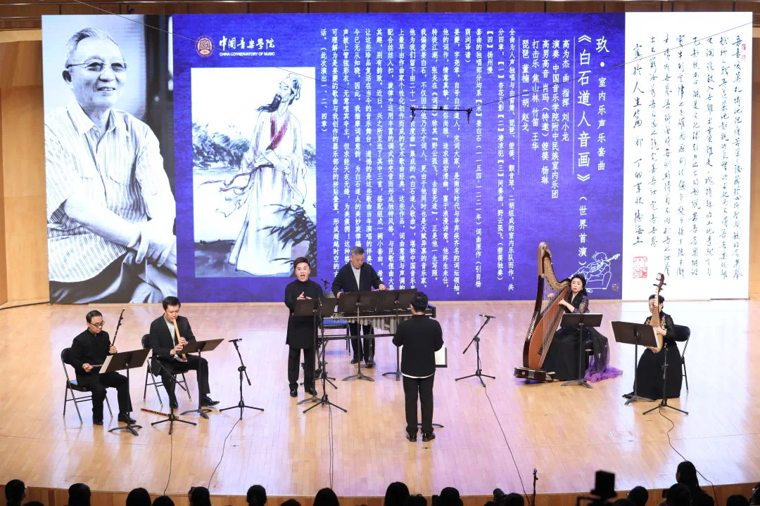 作曲系教授、博士生导师,著名作曲家高为杰先生根据肖玛老师的演唱特点精心编配谱写的室内乐声乐套曲《白石道人音画》。该部作品的词曲选自南宋大家姜白石的三曲传世佳作,分别为《杏花天影》《凄凉犯》《扬州慢》套曲的第三曲高为杰教授巧妙的创作由箜篌独奏的间奏曲《野云孤飞》,形成了一套独具中国音乐艺术魅力的室内乐声乐套曲,该套曲是本次音乐周中唯一的一套声乐作品,此次演出也是该作品的世界首演。