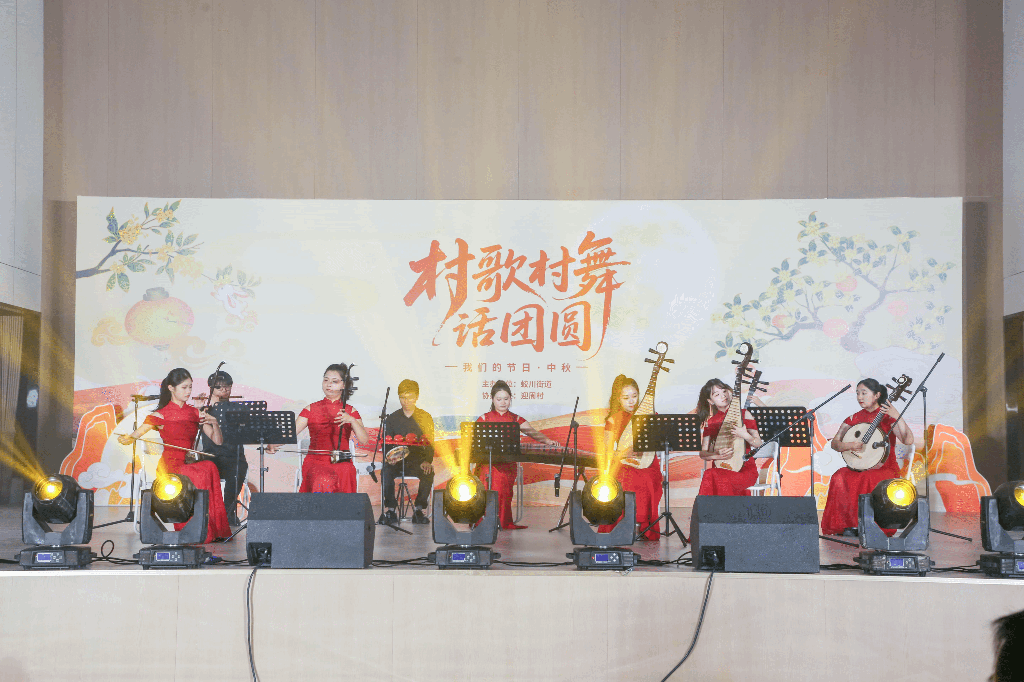 民乐团以一曲承载着团圆意象的经典民乐《花好月圆》,为这场乡村中秋盛宴拉开序幕。演出伊始,二胡、琵琶、中阮、竹笛、古筝与打击乐的齐奏瞬间点燃氛围,紧接着琵琶与二胡交替承接主旋律,竹笛的点缀更似月光洒落,将《花好月圆》的灵动与温馨诠释得淋漓尽致。五种器乐与打击乐的协作,让经典旋律刚开场就充满鲜活张力。